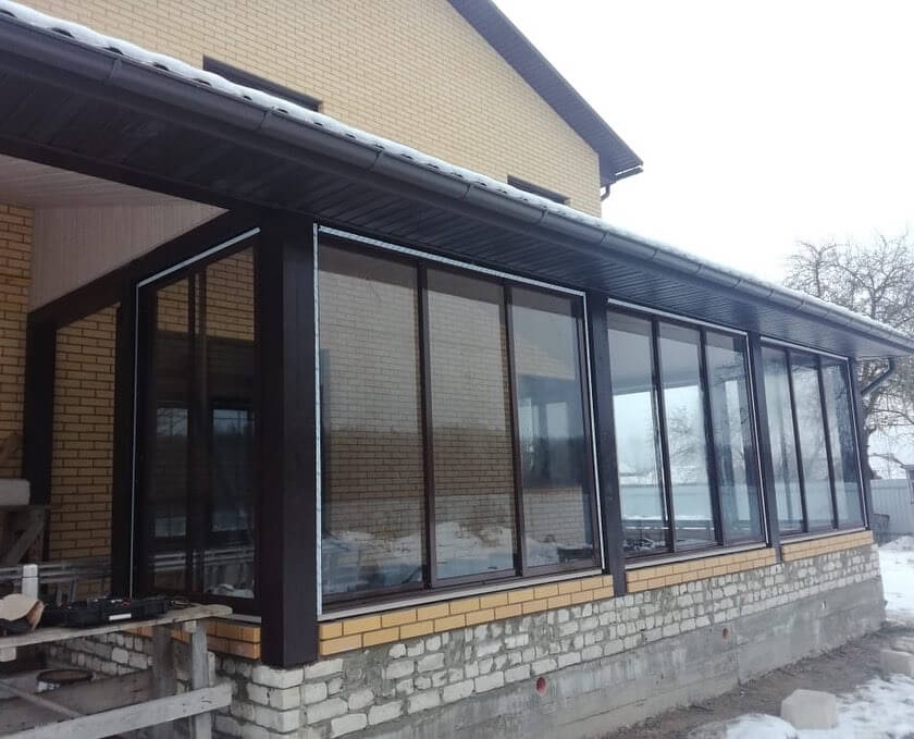 Глухое остекление не имеет створок. Оно подходит для участков, где не требуется открывание, и отличается хорошей жесткостью. Но для проветривания его обычно комбинируют с открывающимися секциями.