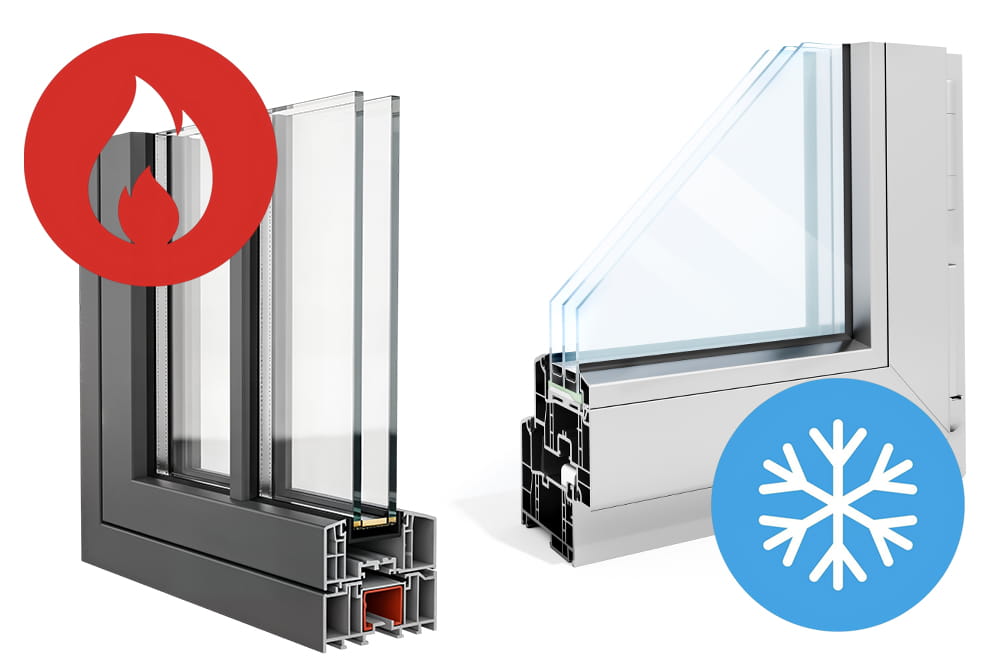 Кроме терморазрыва, в теплых системах часто предусмотрены более сложные уплотнительные контуры, увеличенная монтажная глубина и возможность установки толстого стеклопакета. В жилом остеклении применяют двухкамерные стеклопакеты, энергоэффективные стекла, мультифункциональные покрытия, теплые дистанционные рамки. Поэтому теплый профиль работает уже как часть полноценного ограждающего контура здания.